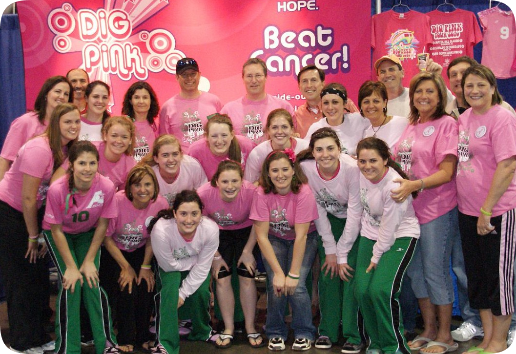 Before Dig Pink, I saw hope as an abstract ideology, more conceptual than concrete. It was an intuitive—but not always realistic—desire for something bigger, better, or brighter. I’d always thought of it as something that can falter and is fleeting. But I learned through my experience with Dig Pink that hope is infinitely more than that. It perseveres. Doubt and worry can be overcome by its selfless faith. Hope took a more tangible form for me when people responded fiscally by pulling out their wallets and contributing to the cause. I saw it in the actions of my friends and family, along with the other thousands of supporters of Dig Pink through their contributions of time and money. The Dig Pink foundation would not exist without hope. And now, in my mind, nothing shouts hope louder than the rosy pink shirts or the Side-Out Foundation logo.