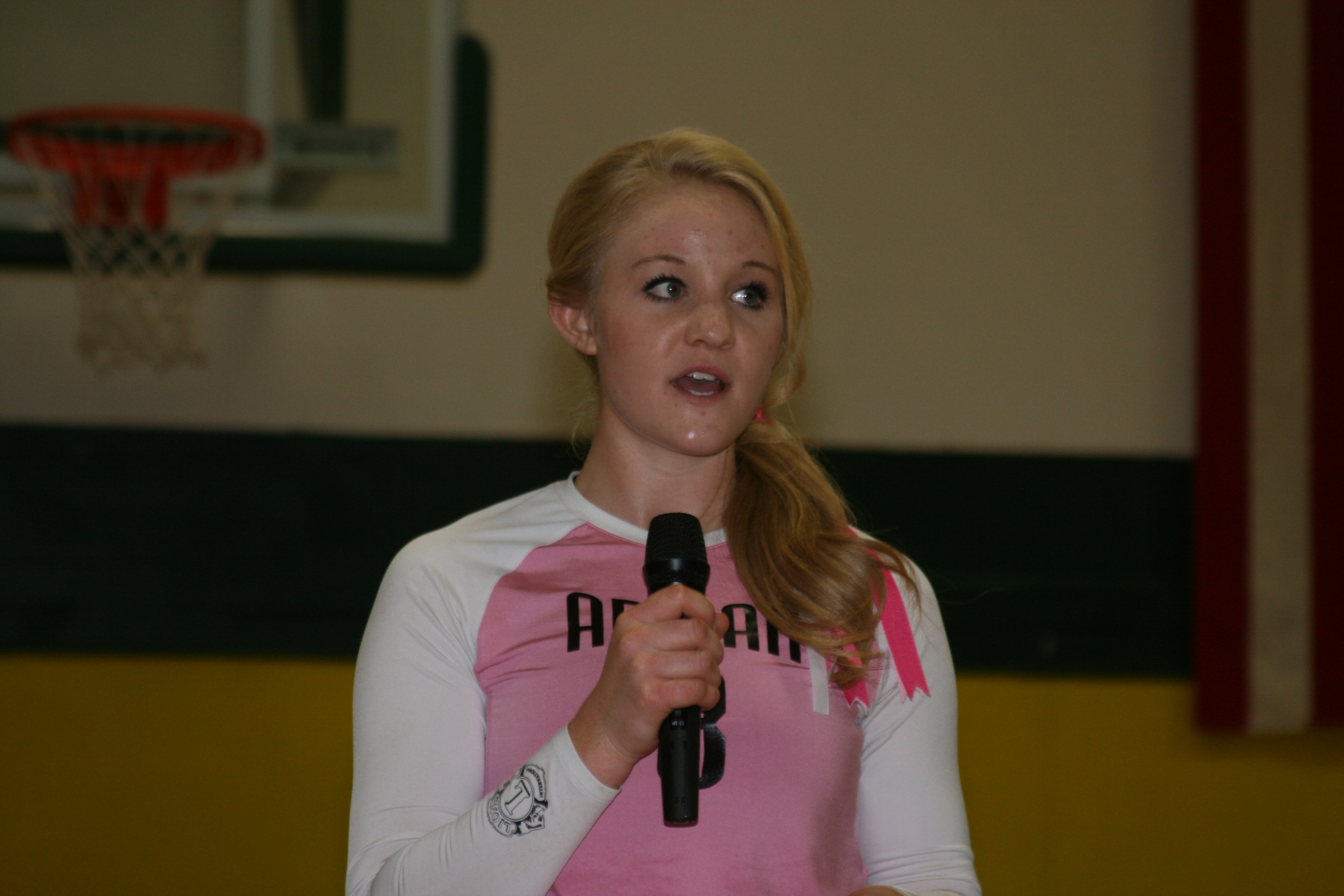 The next day, with the help of my teammates and family members, I spent all day decorating the gym and the hallways leading into the gym. That night I gave a speech before the game, I shared statistics about how many women are affected with breast cancer annually, statistics about breast cancer survivors, and what the community could do to help the fight against breast cancer. I introduced a breast cancer survivor from our very own community who had agreed to talk about her battle. It was a very inspirational and moving speech that touched the hearts of everyone who attended. I was able to raise over $600 through the Dig Pink event!